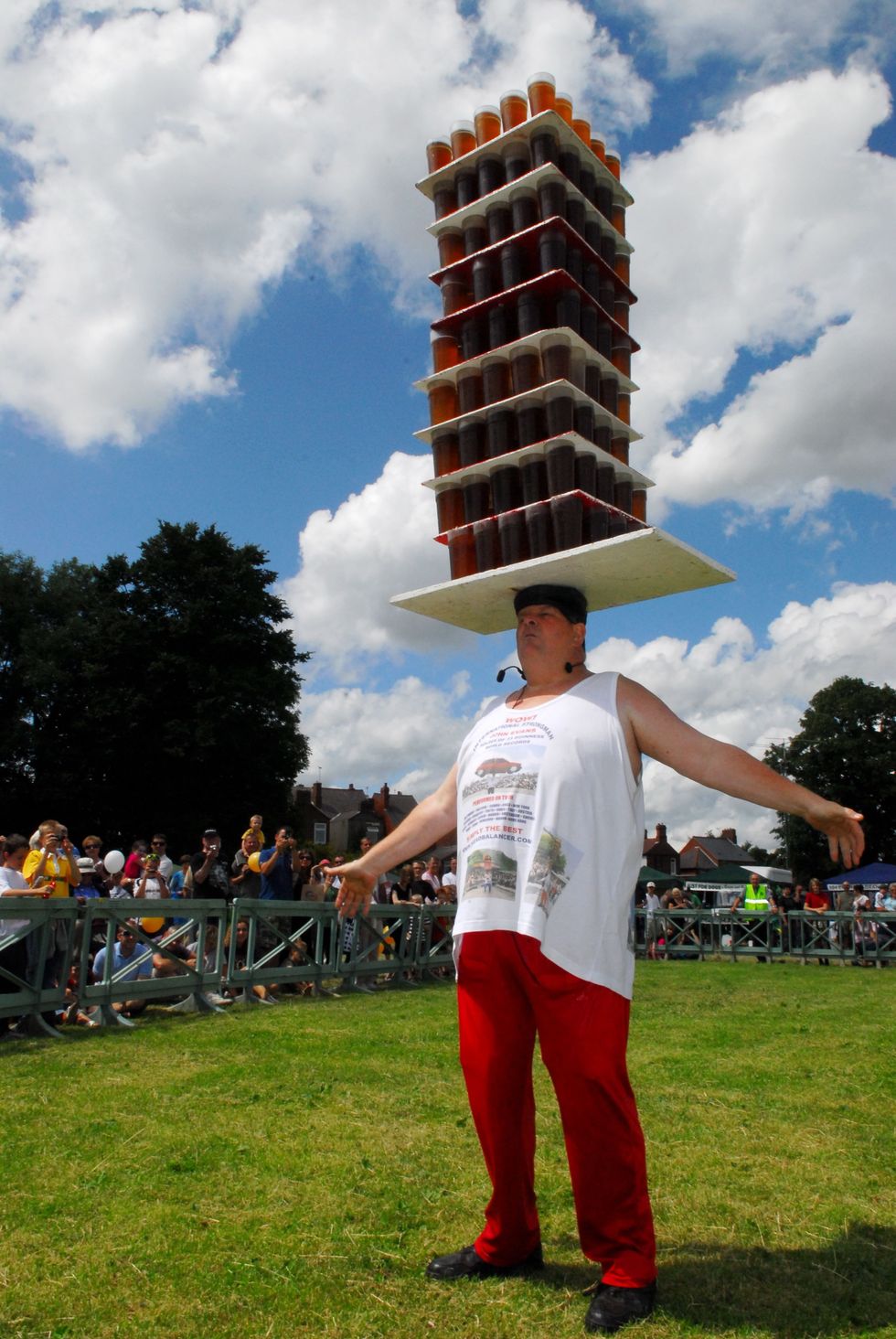 “I’ve got the strong legs and strong neck,” he explains. “I have to move around to compensate for the weight I’ve got on my head. I do it completely with my hands away from what I’m balancing. That big stack of pints of beer, you can see me moving my head and neck to keep them up.”